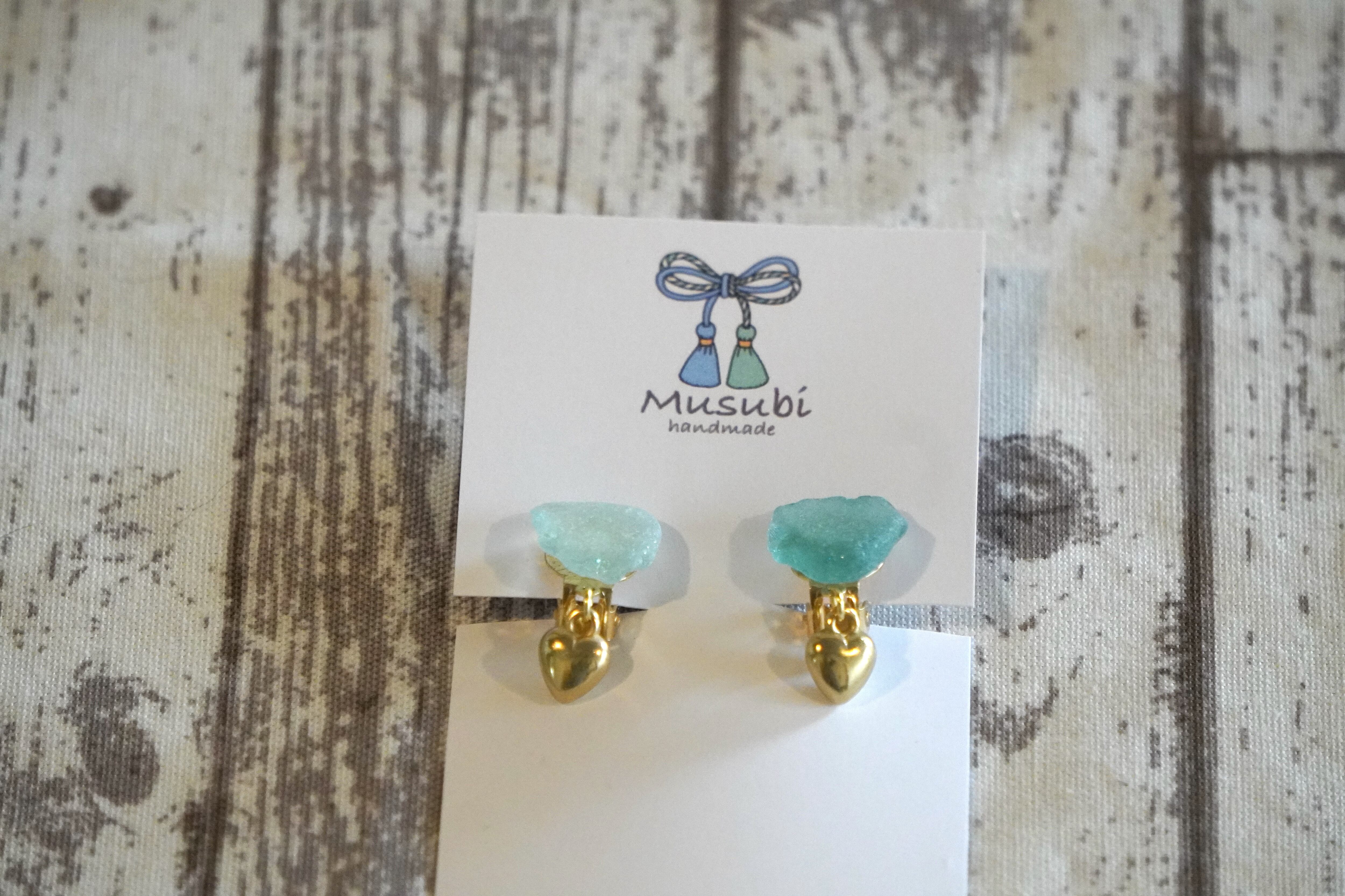 ビーチグラスのイヤリング(2blue&gold heart)